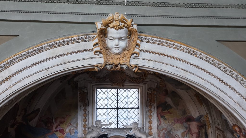 L’impostazione architettonica dipinta – tra cornici dorate, elementi a stucco e quadrature