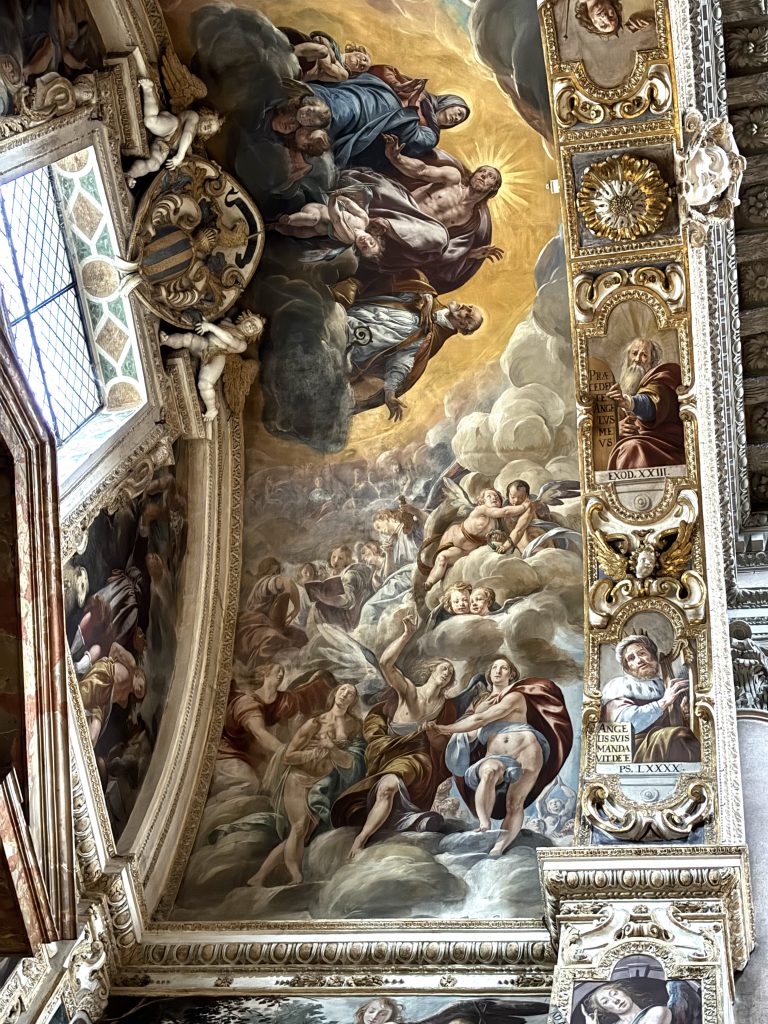 Il soffitto della cappella della Madonna di Loreto, come quello dello scurolo, si offre secondo una