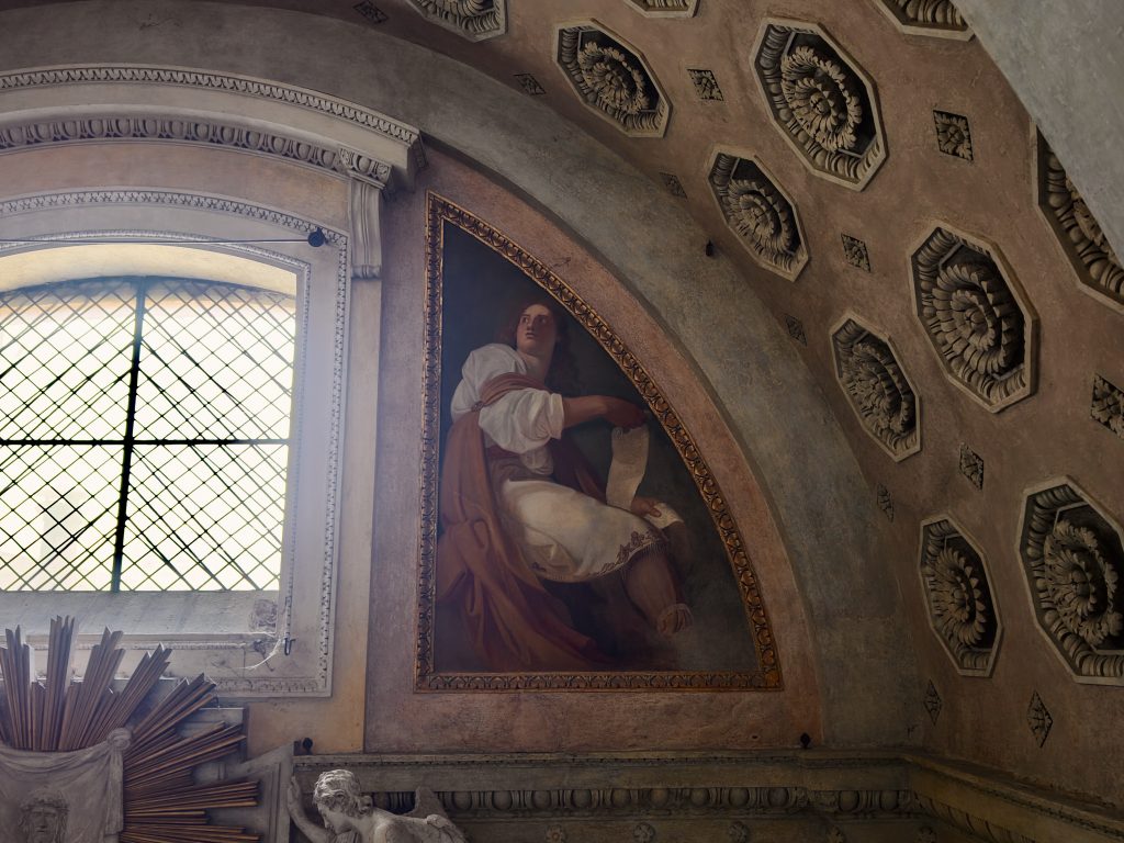 Il soffitto del sacello è infatti dipinto a finti lacunari dorati con al centro un cupolino simulato, oltre