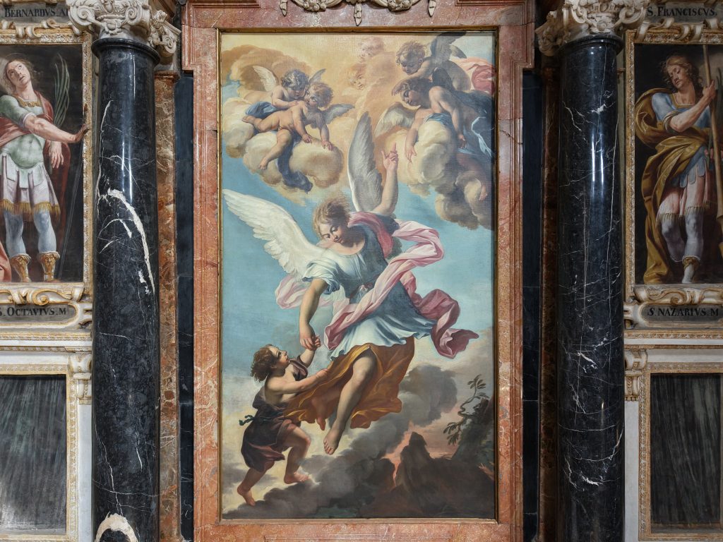 Su quest’ultimo vale la pena ipotizzarne alcuni passaggi. Nell’inventario dello stesso Ottavio, alla atto della divisione dei quadri dell’eredità tra i figli successori, nel 1657, era citato nello studio di casa «un quadro dell’angelo custode sopra la tela con cornice che indirizza l’huomo alla strada del cielo e che è per anchora all’altare della cappella di San Gaudenzio». Lo stesso quadro ritornava puntualmente citato delle quadrerie degli eredi Nazari, senza alcun riferimento a un suo utilizzo nella cappella in San Gaudenzio. Credo che esso possa essere riconosciuto nell’immagine con questo soggetto che il vescovo Giulio Maria Odescalchi nel 1657, nel corso della sua visita alla chiesa, registrava sull’altare della cappella lamentando che fosse «valde parva in comparatione iconica». A tale mancanza gli eredi di Ottavio, Carlo e i fratelli, promettevano di sopperire, ma in realtà l’altare fu completato con la tela solo più tardi con l’arrivo dell’opera con l’Angelo Custode di Giacinto Brandi. Ma questa è un’altra storia su cui attendono ulteriori indagini.